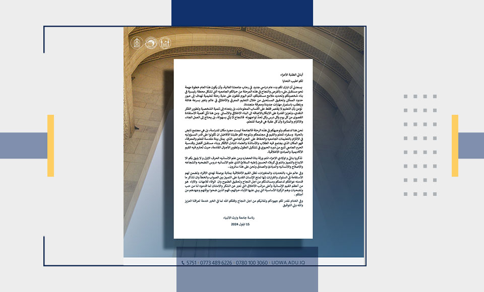 رسالة رئاسة جامعة وارث الانبياء لطلبتها الاعزاء بمناسبة بدء العام الدراسي الجديد