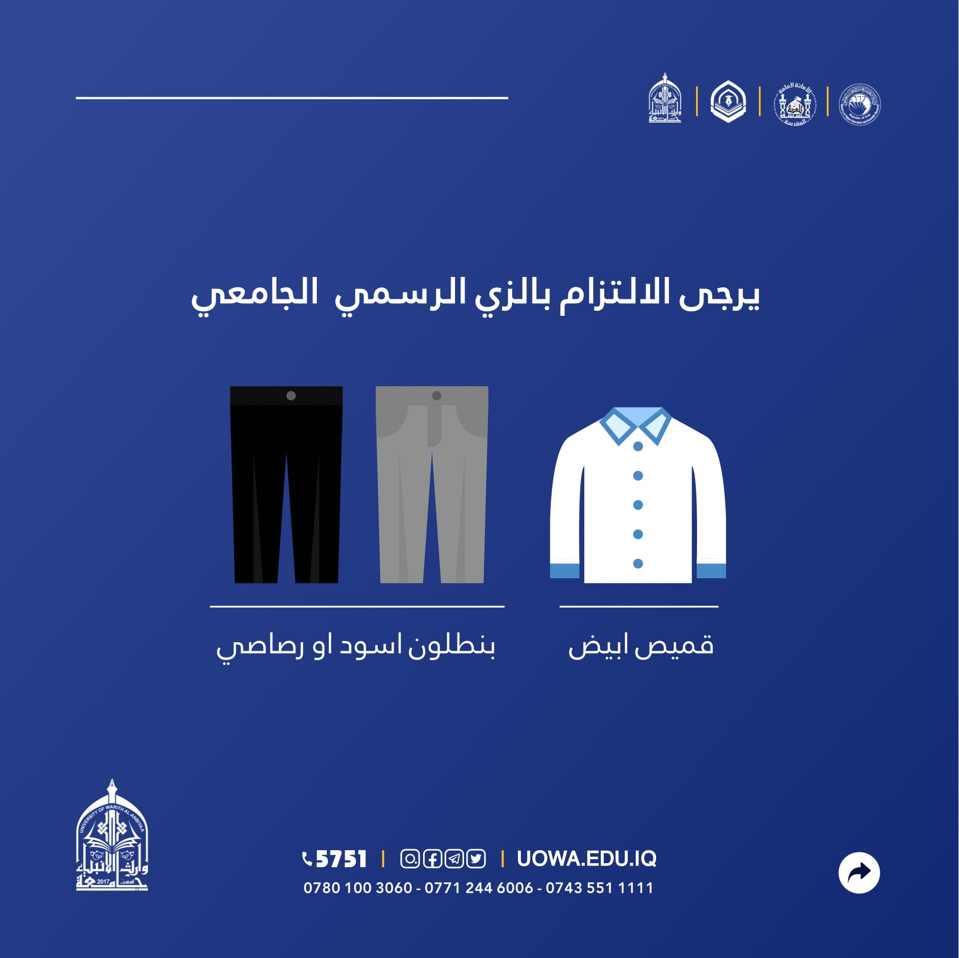فعلى الطلبة الحضور قبل الوقت المذكور اعلاه لضمهم ضمن الكردوس المخصص لجامعتنا بالزي الجامعي (بنطرون اسود او رصاصي مع قميص ابيض).