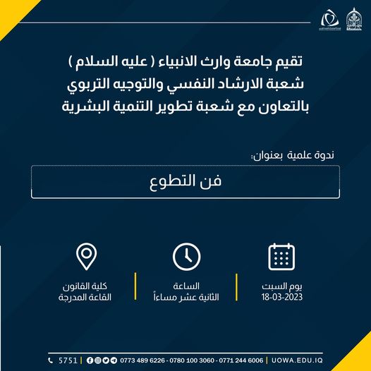 تقيم جامعة وارث الأنبياء (عليه السلام)، وبالتعاون مع شعبة التأهيل والتوظيف والمتابعة