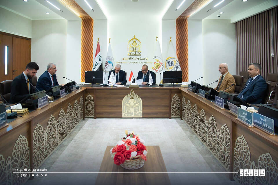 Professor Dr. Ibrahim Saeed Al-Hayawi, President of the University of Warith Al-Anbiyaa (PBUH), signed a scientific cooperation agreement with the Arab Union for Digital Empowerment in the State of Libya, represented by its President, Professor Dr. Abbas Al-Jubouri, in the presence of the university’s vice presidents.