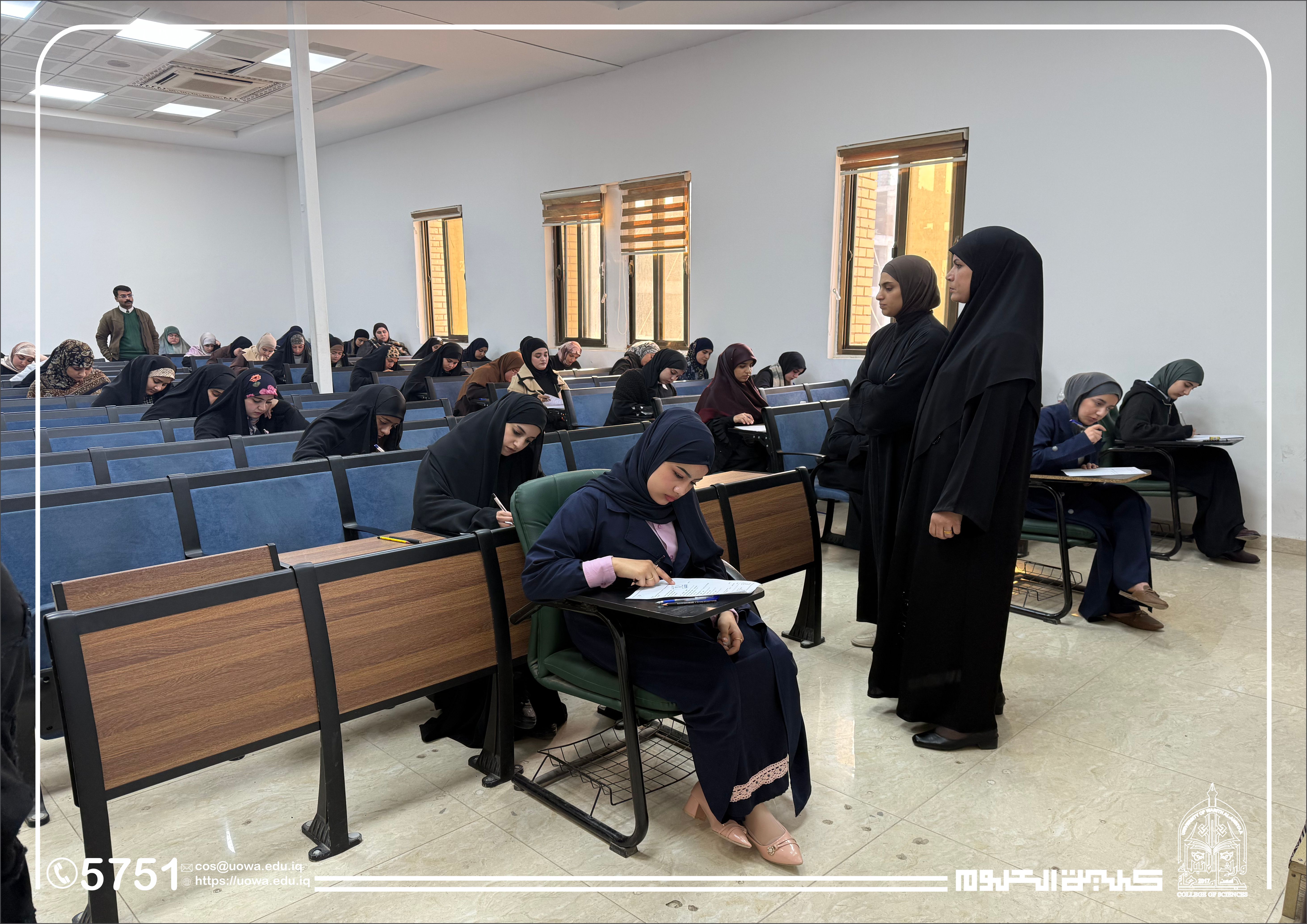 In the context of his continuous follow-up of the academic process and his commitment to providing an appropriate examination environment, the Dean of the College of Science at Warith Al-Anbiyaa University (peace be upon him) conducted an inspection tour of the examination halls to monitor the progress of the midterm examinations for first-year students in the Departments of Medical Physics and Forensic Evidence.
