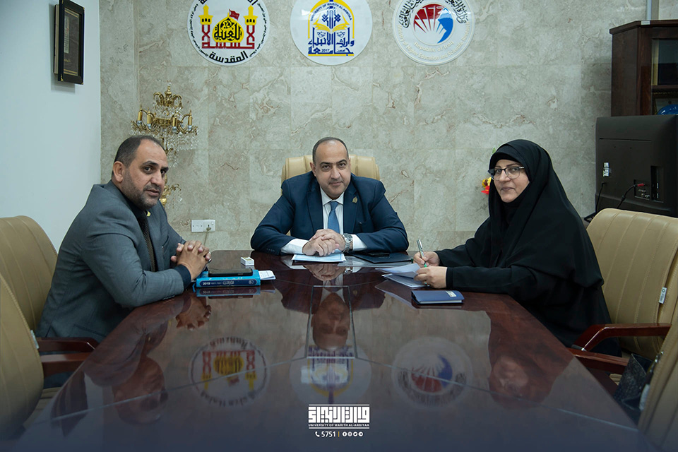 The University of Warith Al-Anbiyaa (PBUH) hosted a meeting between the presidents of the three universities affiliated with the Holy Shrine of Imam Hussain. Professor Dr. Ibrahim Saeed Al-Hayawi, the President of the University of Warith Al-Anbiyaa (PBUH), welcomed Professor Dr. Zainab Al-Sultani, the President of Al-Zahra University (PBUH) for Girls, and Professor Dr. Abbas Al-Daami, the President of the Technical Education Authority.