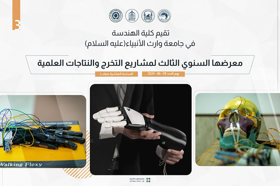 Under the patronage of the President of the University of Warith Al-Anbiyaa (PBUH), Professor Dr. Ibrahim Saeed Al-Hayawi, and under the supervision of the Dean of the College of Engineering, Assistant Professor Dr. Hussein Hadi Hussein, the College of Engineering is organising its third engineering exhibition entitled “Al-Warith Engineering Exhibition for Graduation Projects and Scientific Productions” on Sunday, June 9, 2024.