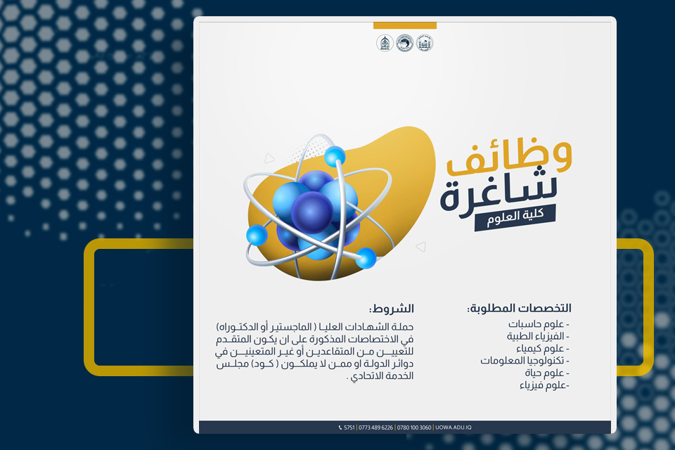 The University of Warith Al-Anbiyaa (PBUH), The College of Science, announces its need for job positions in order to fulfil its long-term goals and bolster its teaching staff.