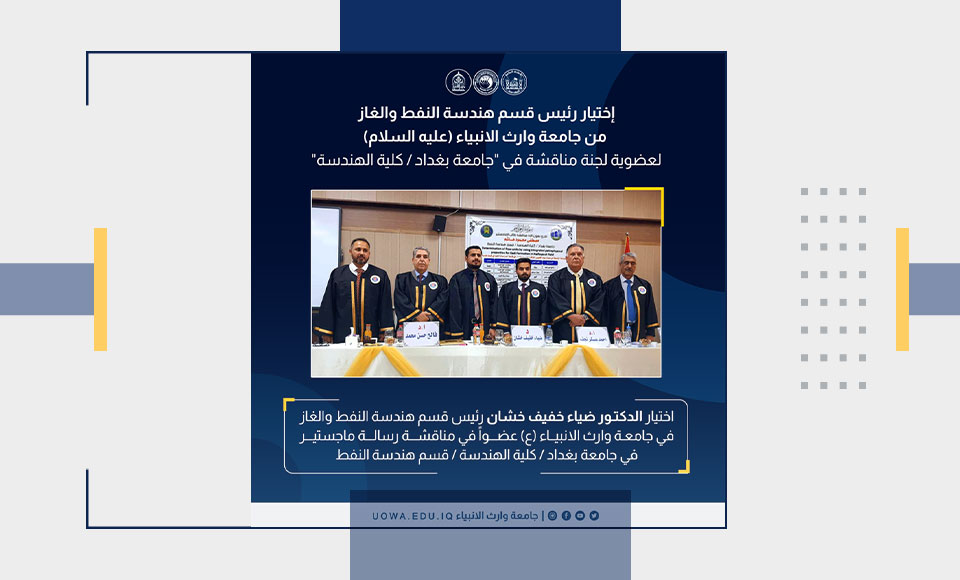 Dr. Dheiaa Alfarge, Head of the Department of Oil and Gas Engineering at the College of Engineering, was selected as a member of the committee to discuss a master's thesis for a graduate student at the University of Baghdad. This selection comes in recognition of his extensive experience in the field of oil and gas, which contributes to enhancing the quality of academic debate and supporting specialized scientific research.