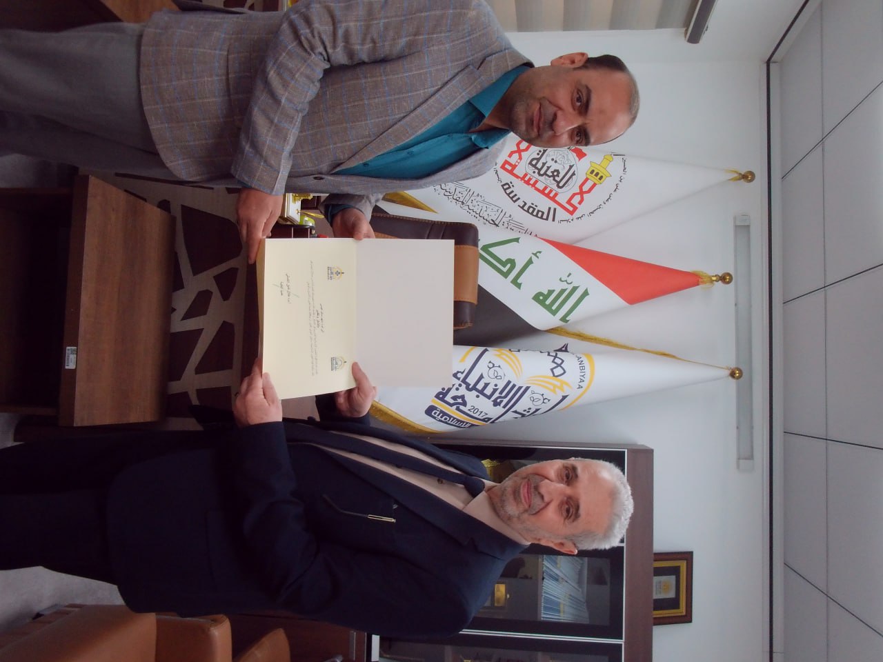 The Dean of the College of Islamic Sciences at Warith Al-Anbiyaa University (peace be upon him), Dr. Talal Faiq Al-Kamali, honored Dr. Mulhim Salem Issa in recognition of his dedicated efforts in establishing the College’s electronic library and linking it to the central library of the Holy Shrine of Imam Husayn.