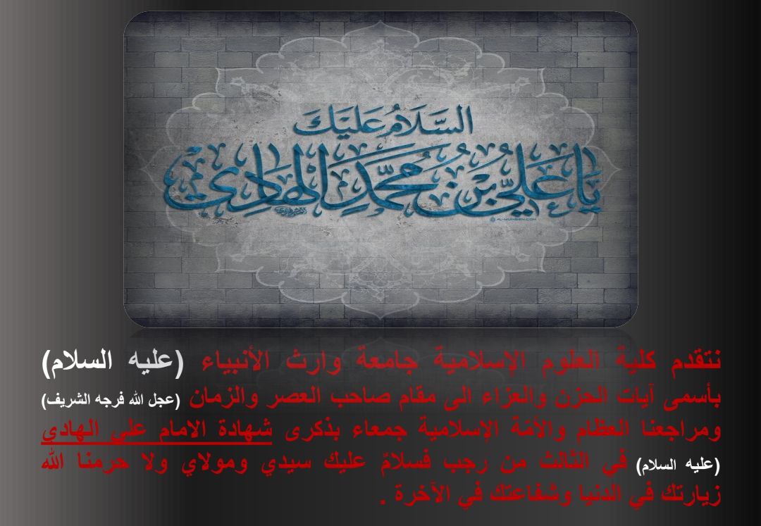 The College of Islamic Sciences, Warith al-Anbiya University (peace be upon him) extends its deepest condolences to the Master of the Age (may God hasten his reappearance), our great authorities, and the entire Islamic nation on the anniversary of the martyrdom of Imam Ali al-Hadi (peace be upon him) on the third of Rajab. Peace be upon you, my master and lord, and may God not deprive us of visiting you in this world and your intercession in the hereafter.