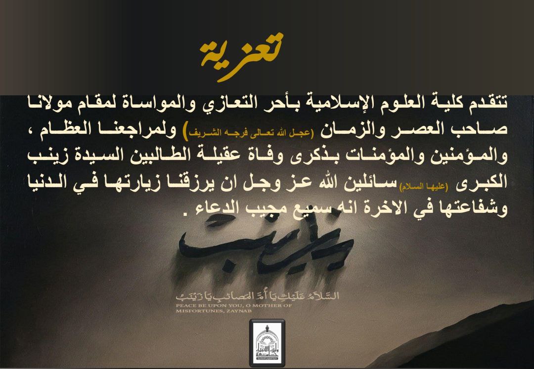 The College of Islamic Sciences extends its deepest condolences to the Master of the Age (may God Almighty hasten his honorable reappearance), to our great authorities, and to the faithful men and women on the anniversary of the death of the Lady of the Seekers, Lady Zainab the Great (peace be upon her), asking God Almighty to grant us the ability to visit her in this world and her intercession in the hereafter, for He is the All-Hearing, the Answerer of prayers.