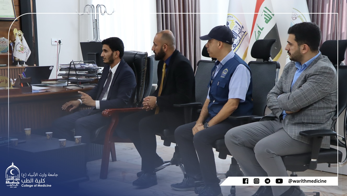 To follow up on the success of the TBL online exams, the Dean of the College of Medicine at Warith Al-Anbiya University, Professor Dr. Ali Abdul Saadoun Al-Ghazi, held a meeting with the Director of the Computer Center, department heads at the center, and the head of the college's Digital Department to discuss the progress and success of the online exams conducted using the Problem-Based Learning (TBL) system. The meeting addressed the evaluation of the technical performance in the exam halls, the efficiency of the electronic infrastructure, and the technical support mechanisms that contributed to the success of the experience.