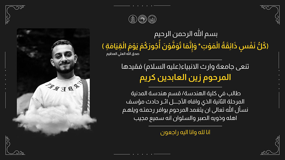 The Governance of the University of Warith Al-Anbiyaa (PBUH), along with the Faculty of College of Engineering, mourns the passing of their dear student, Zain Al-Abideen Kareem, a second-year Civil Engineering student, who tragically passed away following an unfortunate accident.