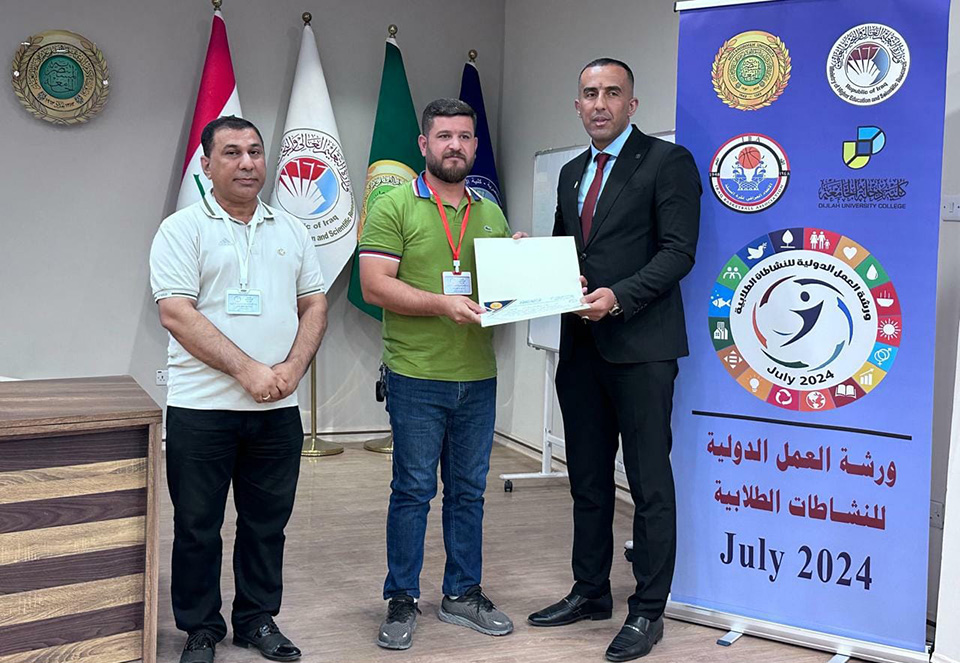 In the international workshop titled "The Joint Strategic Role of University Student Activities and Sports Federations in Organising International Championships and Achieving the Social and Economic Goals of Sustainable Development," lecturer Dr. Hammam Al-Khafaji, head of the department of student activities at the University of Warith Al-Anbiyaa (PBUH), represented the university.